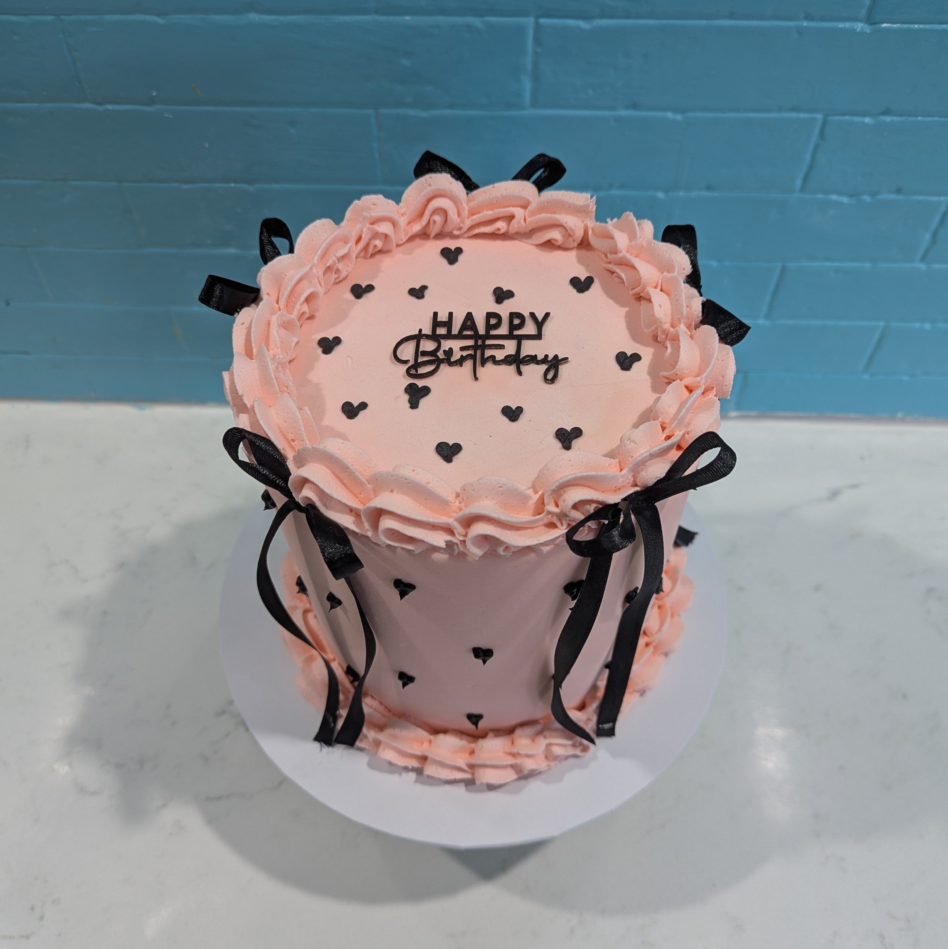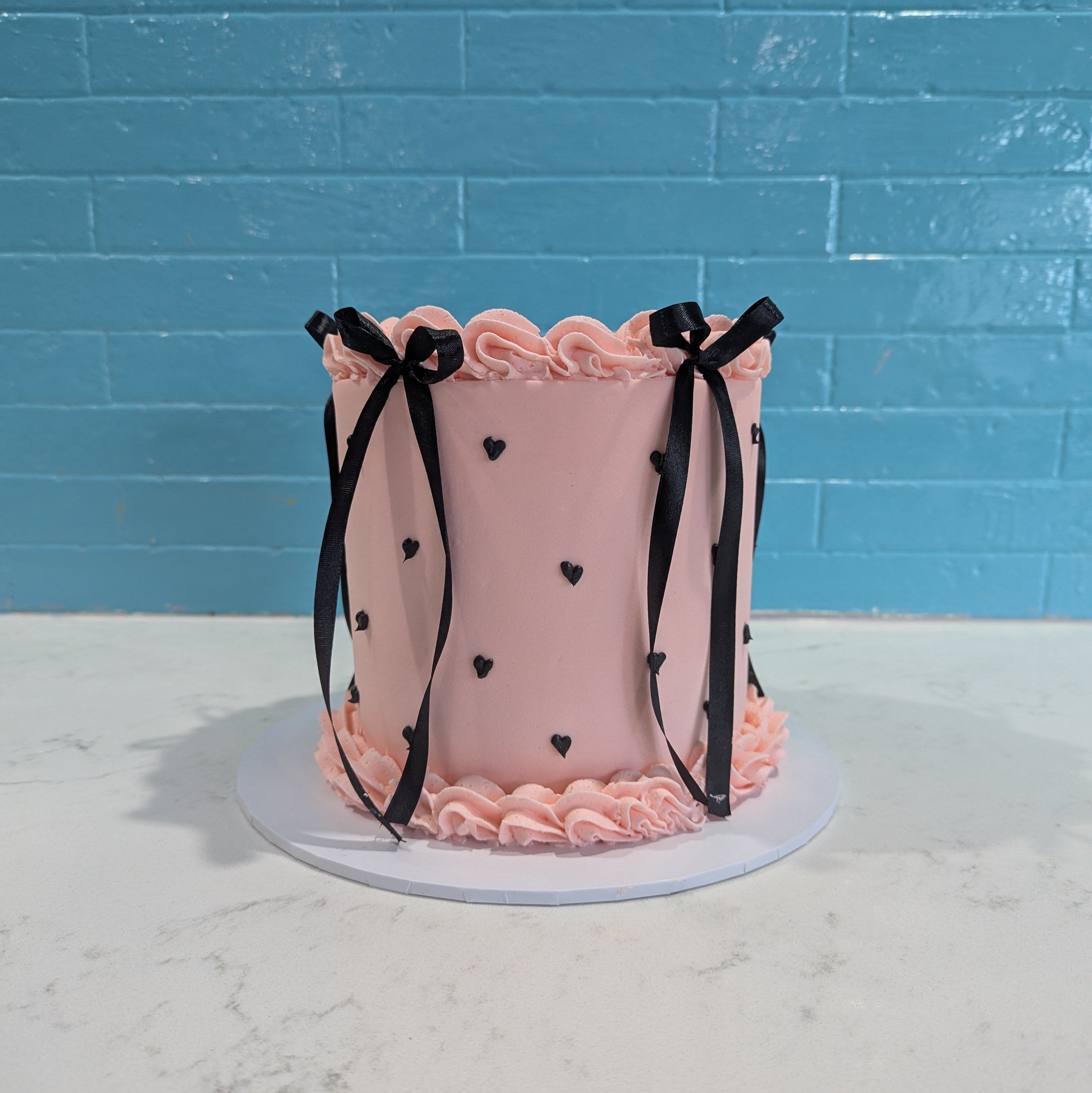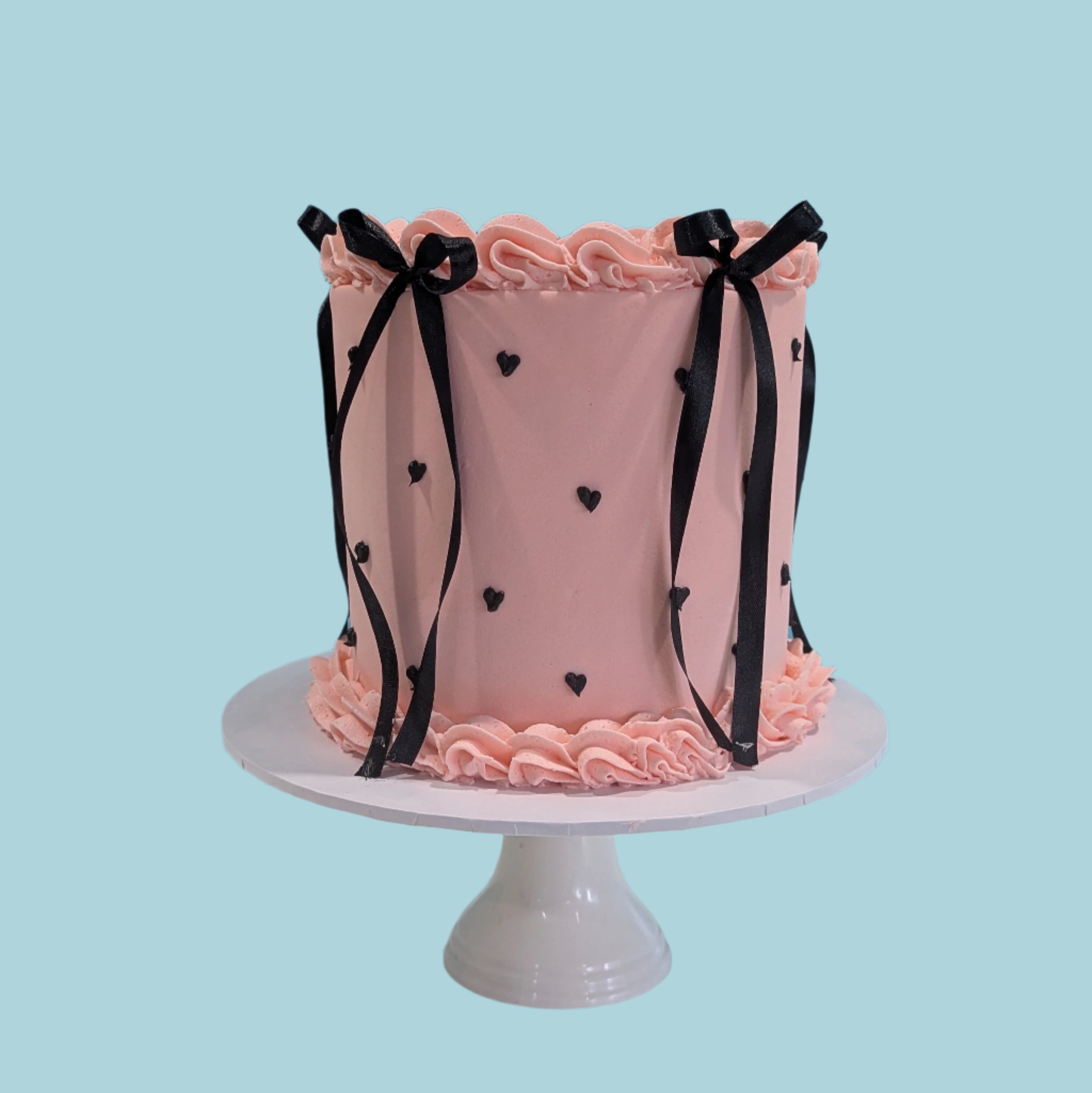 Indulge in decadent vanilla or chocolate sponge cake with a playful twist – Black Betty Bow Vintage Cake. Adorned with delicate piped black hearts and finished with elegant black bows, this cake is perfect for any special occasion. Available in a variety of colors and ready to impress. Excludes acrylic topper.