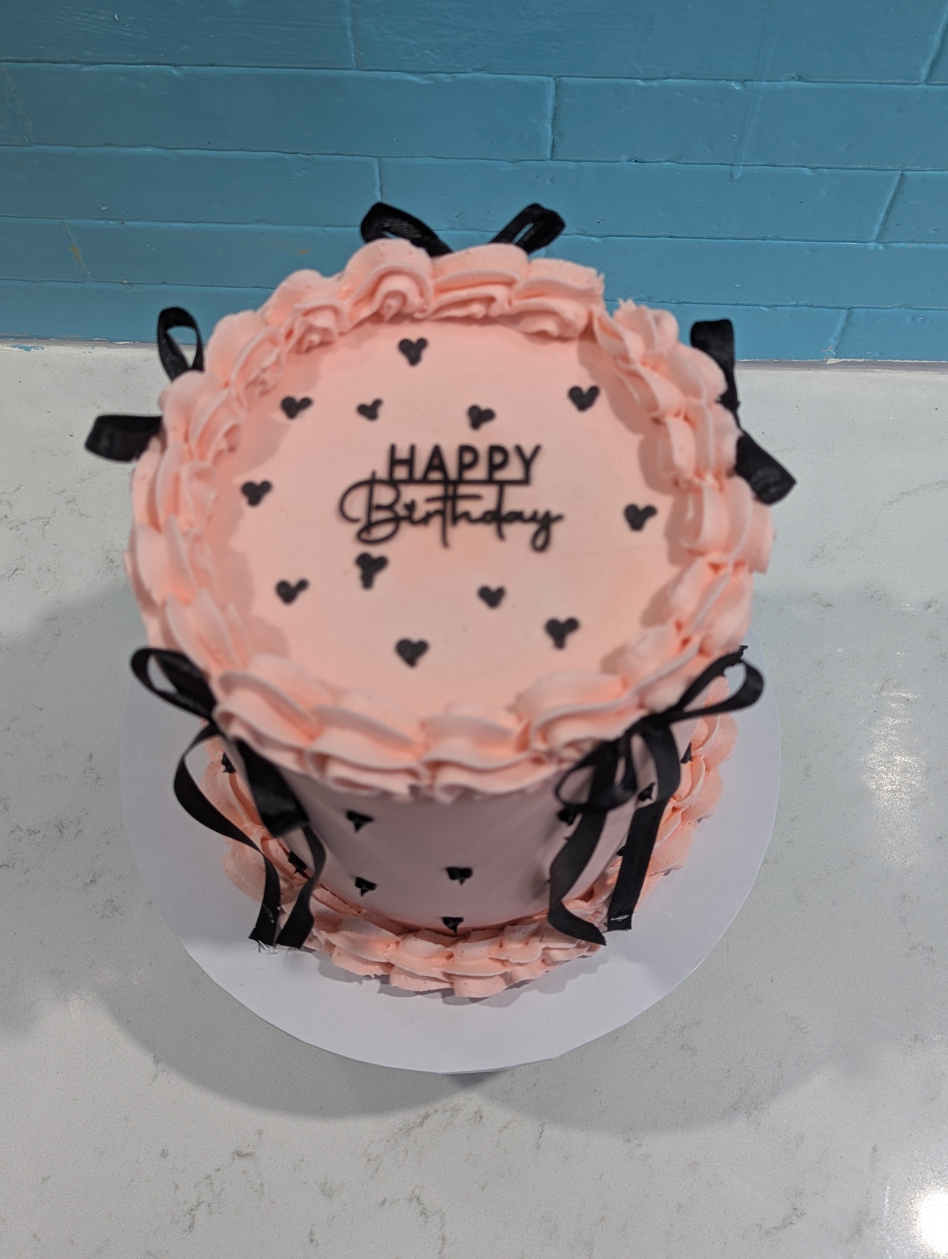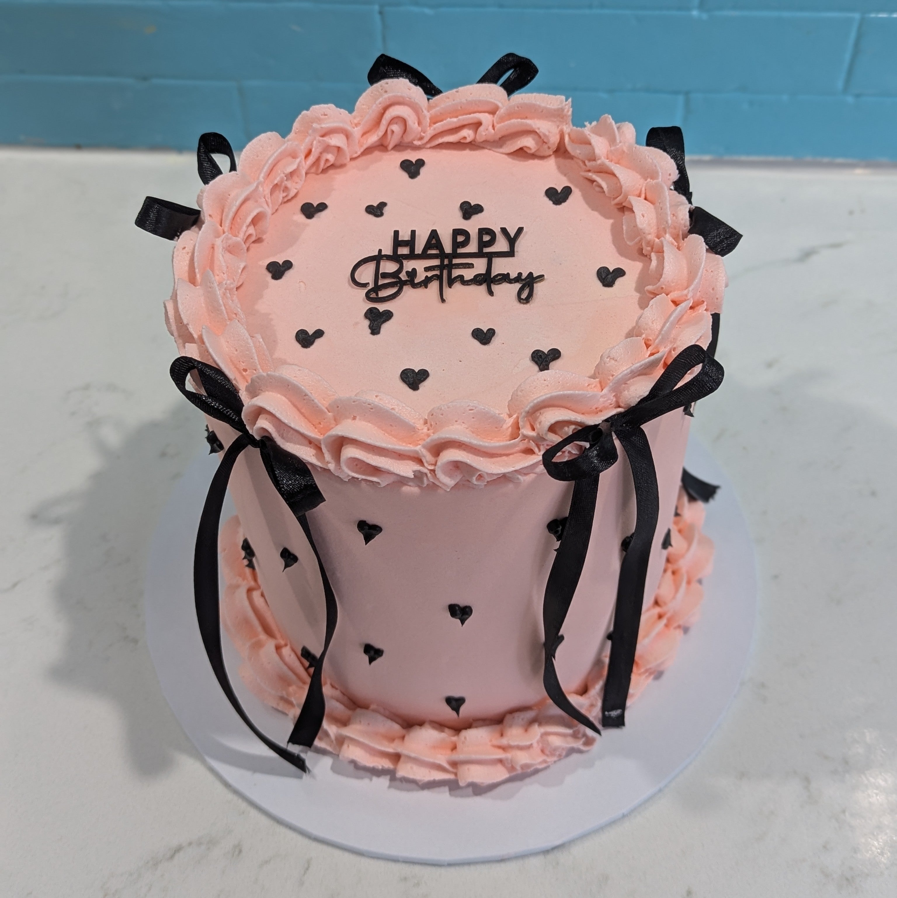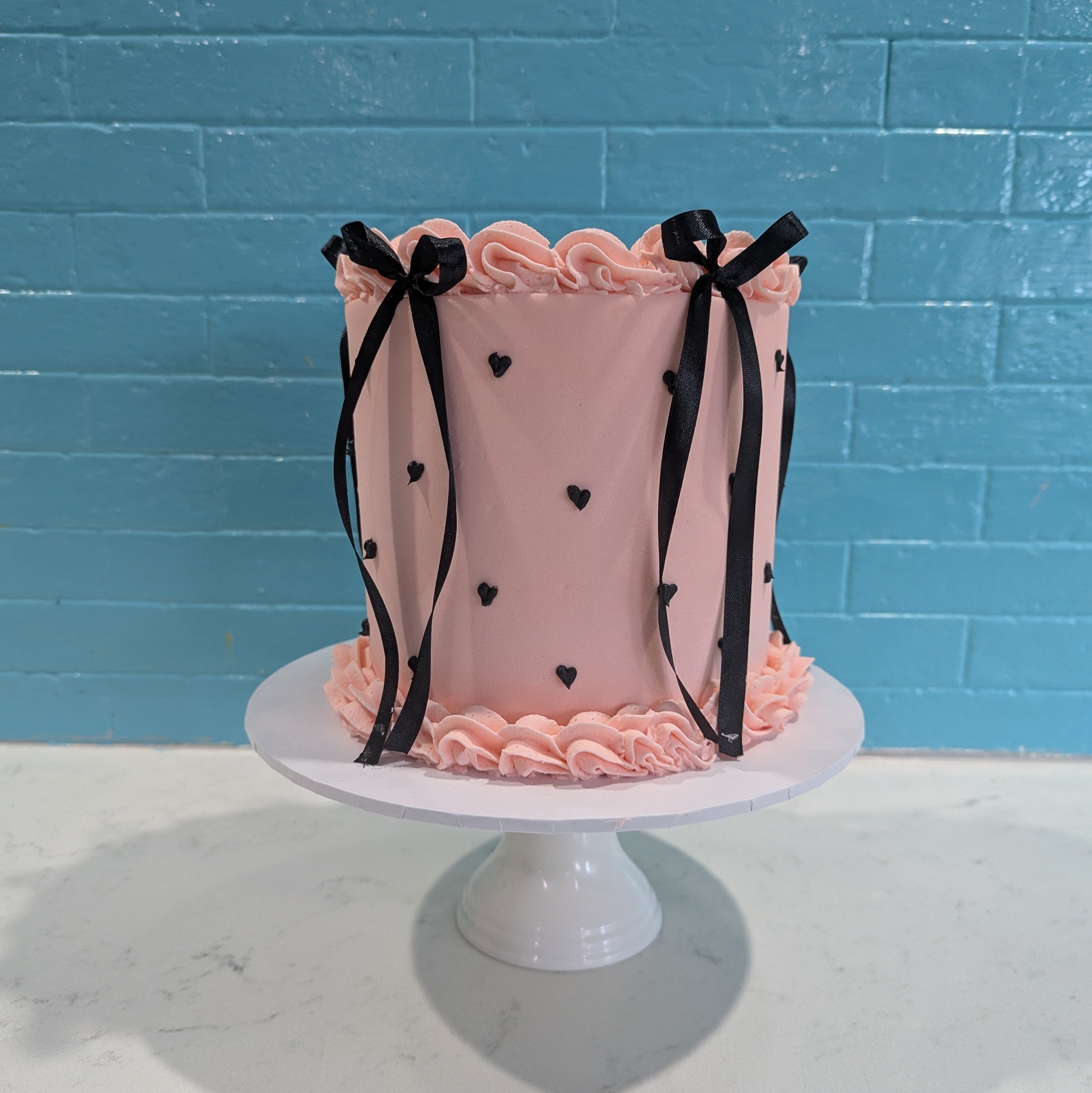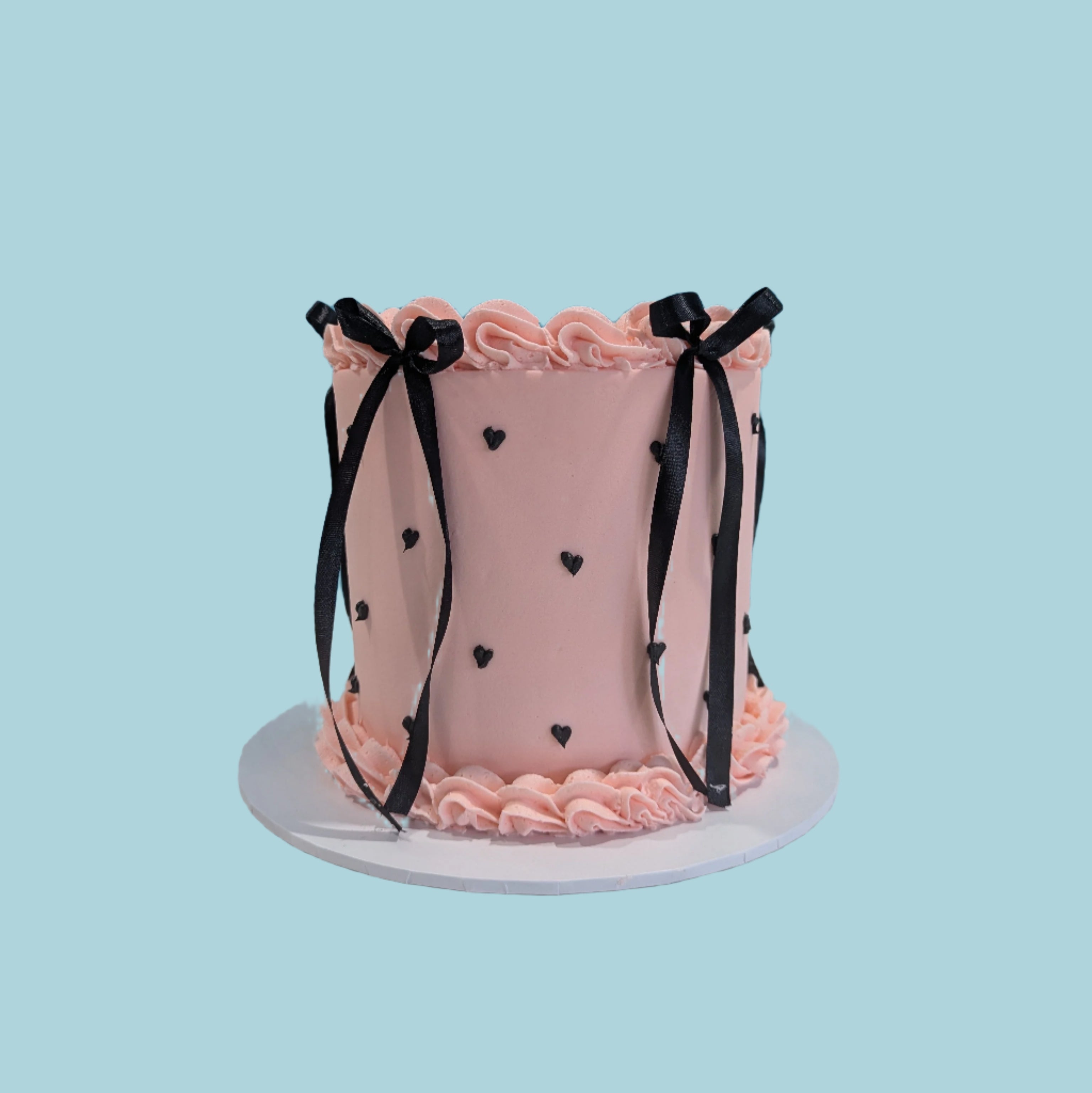 Indulge in decadent vanilla or chocolate sponge cake with a playful twist – Black Betty Bow Vintage Cake. Adorned with delicate piped black hearts and finished with elegant black bows, this cake is perfect for any special occasion. Available in a variety of colors and ready to impress. Excludes acrylic topper.