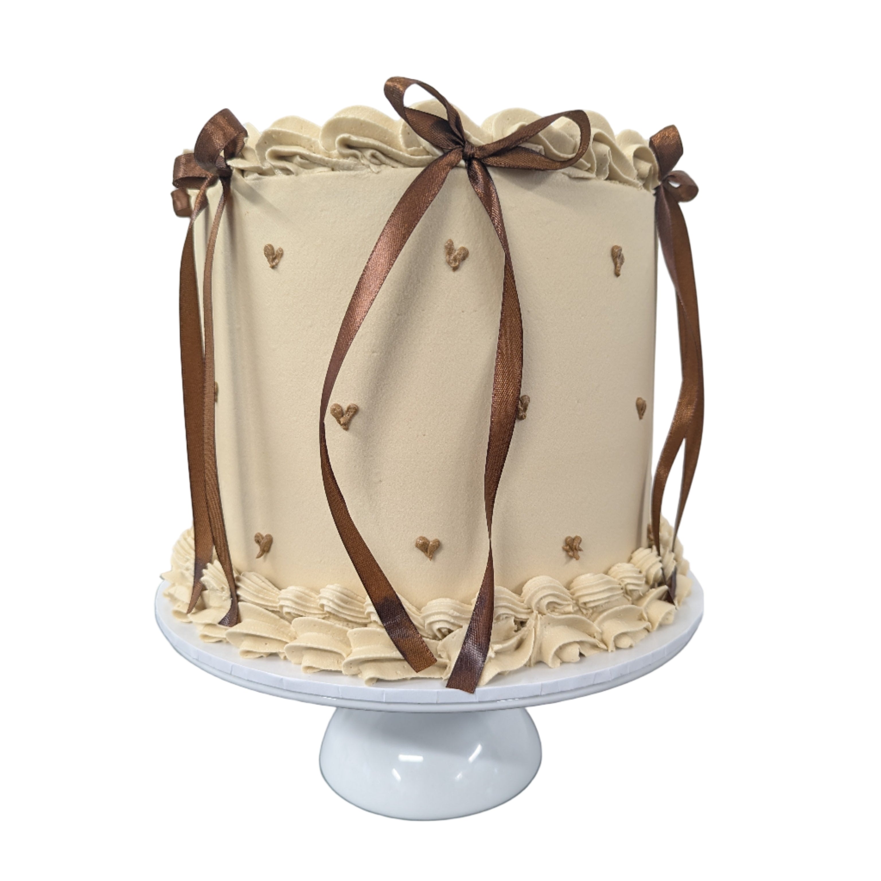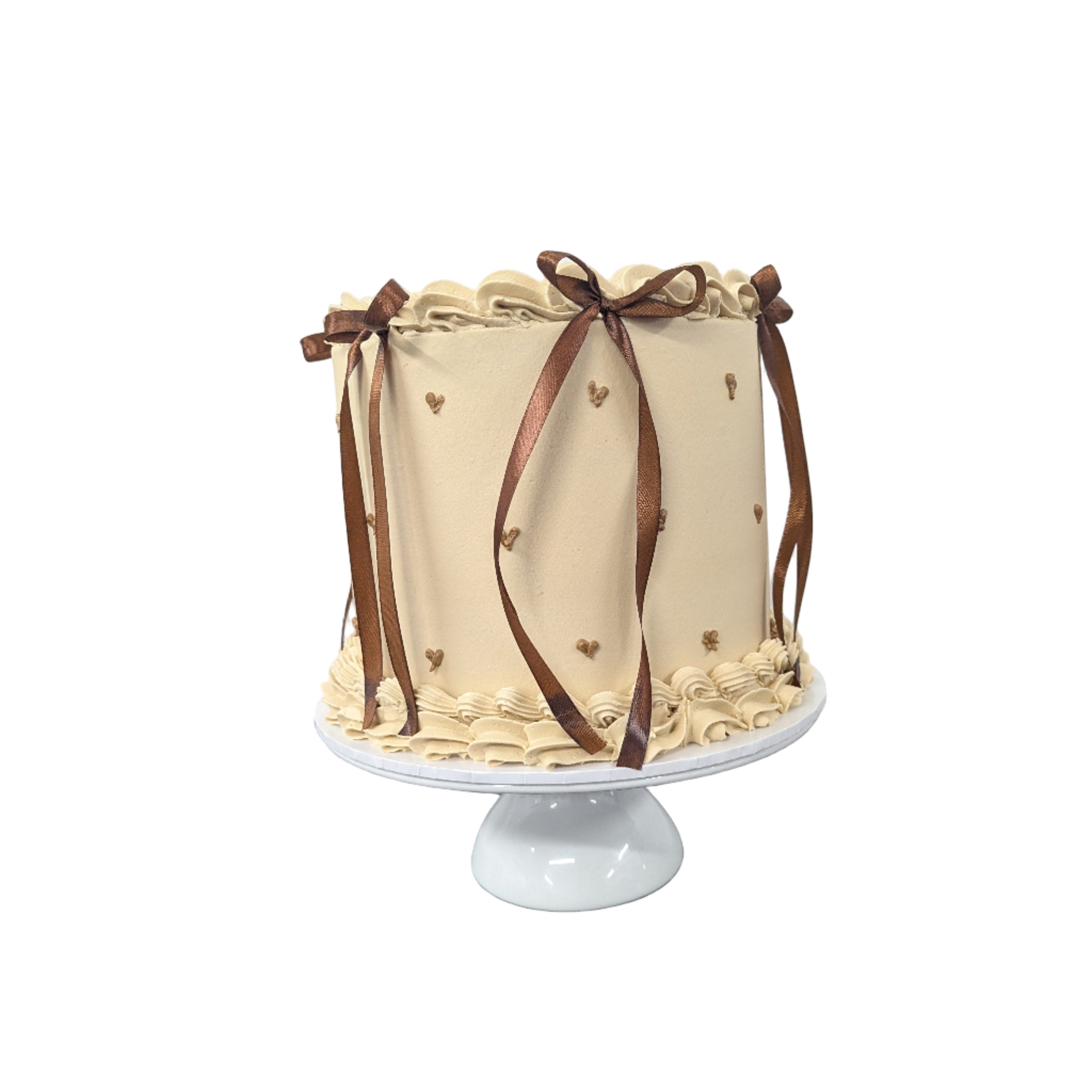 Indulge in elegance with the Bronzed Beauty Vintage Cake, a stunning round cake swathed in delicate beige tones. Adorned with hand-piped hearts and shimmering bronze bows, each detail showcases exquisite craftsmanship. Finished with luxurious vanilla buttercream piping, this cake offers a smooth, creamy texture and a timeless flavour perfect for any special occasion. Elevate your celebration with this classic design that delights both the eyes and the palate.