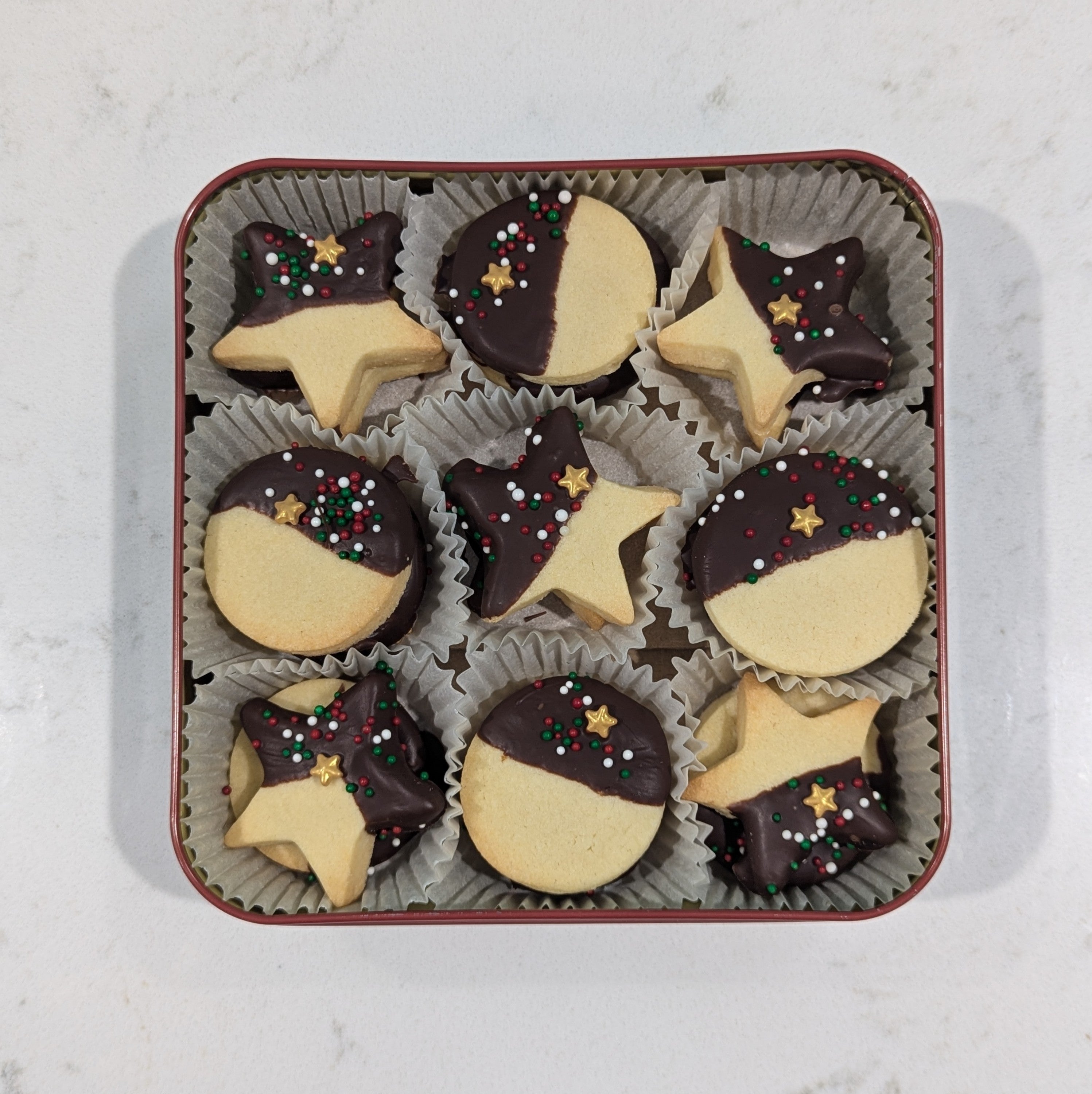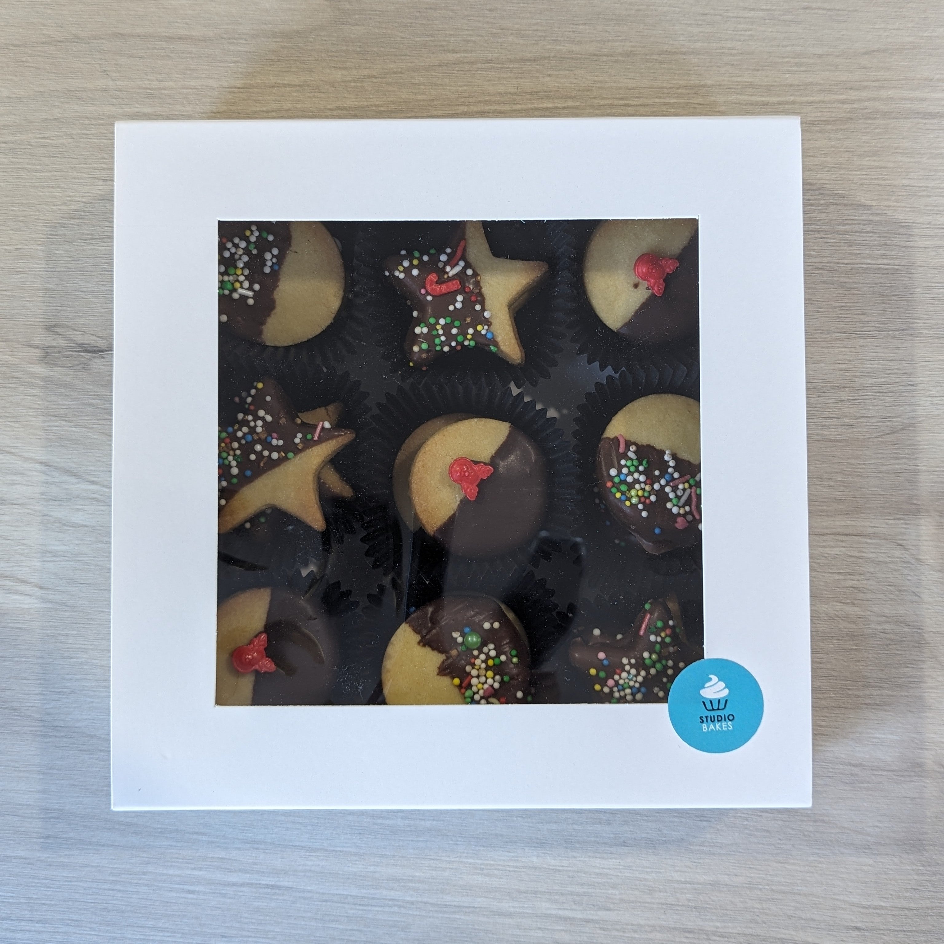18 bite-sized sugar cookies, coated in delicious chocolate and adorned with festive Christmas sprinkles, all packaged up and ready for gifting!