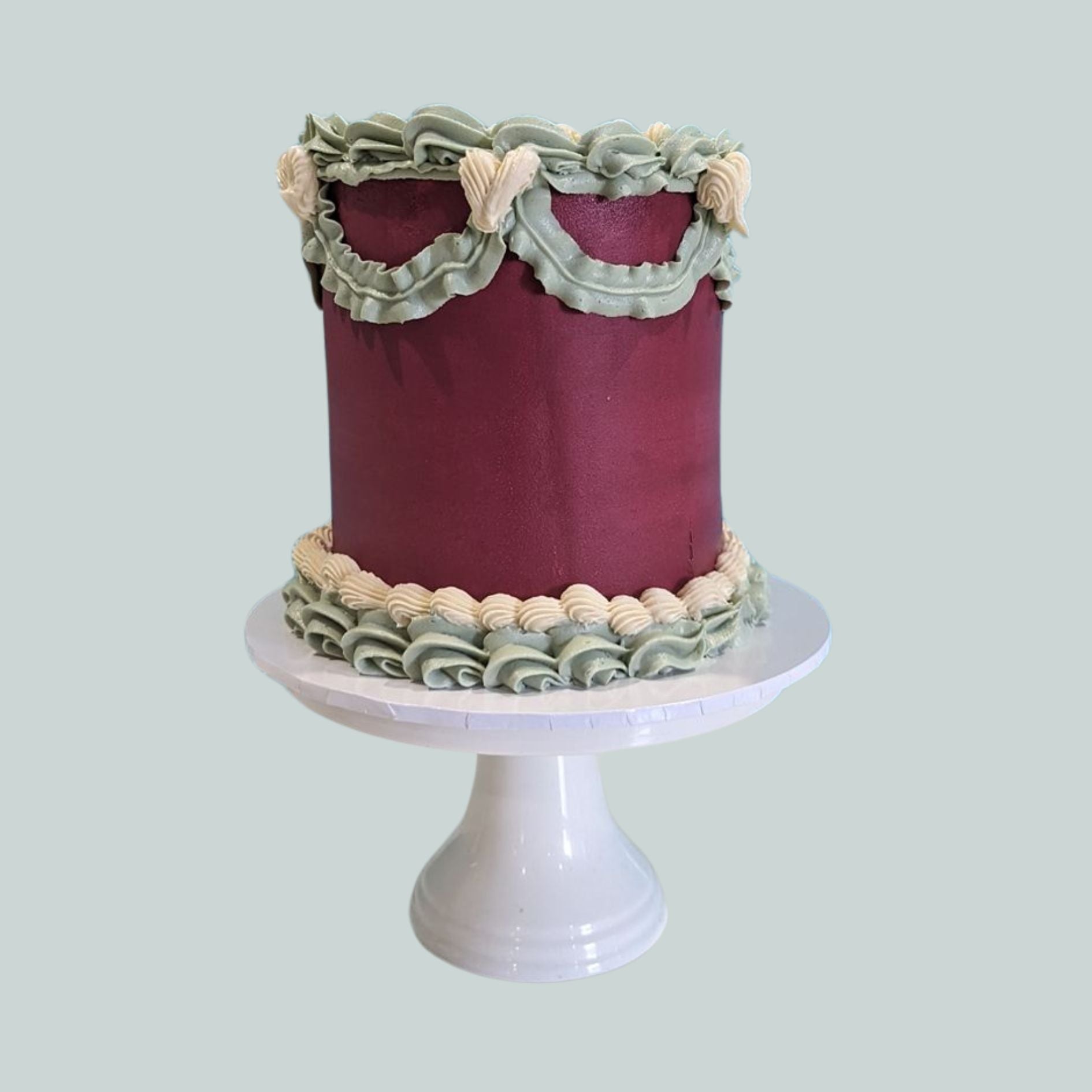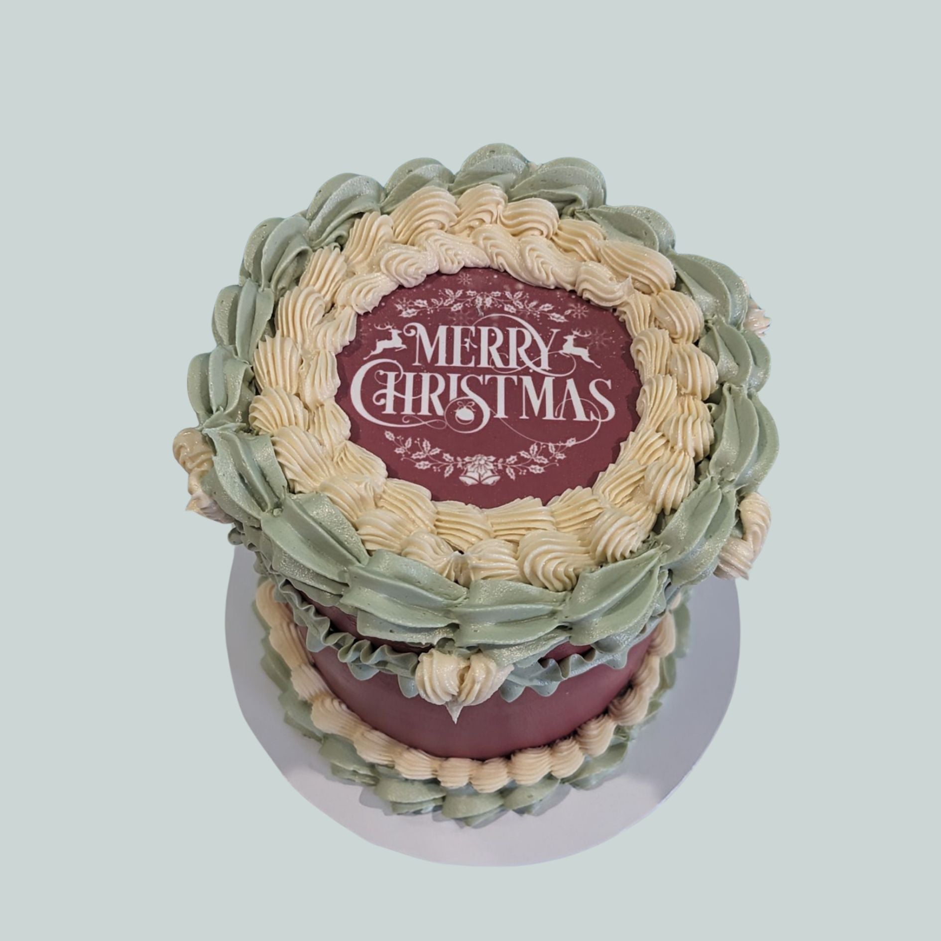 Make a memorable impression with this elegant Christmas Vintage Cake. Featuring a rich burgundy buttercream base adorned with sage and ivory piped details, it's the perfect gift to thank someone special—whether a valued client, family member, or friend. Timeless style meets thoughtful gesture.