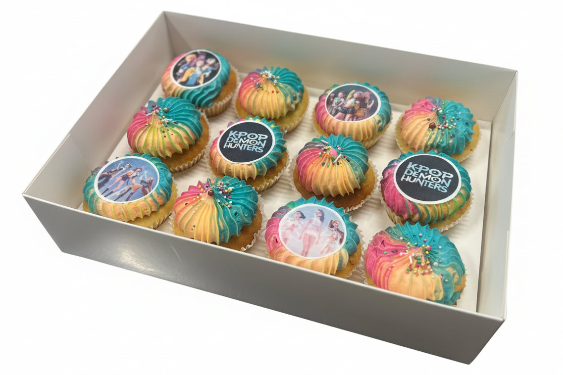 Indulge in the sweetest treat for any K-Pop fan - K-POP Demon Hunters Cupcakes! Choose between a 12 X standard delicious vanilla or chocolate cupcakes, topped with vibrant buttercream swirls and edible images of your favorite demon hunters. Perfect for any occasion, these cupcakes will satisfy both your cravings and your love for K-Pop.