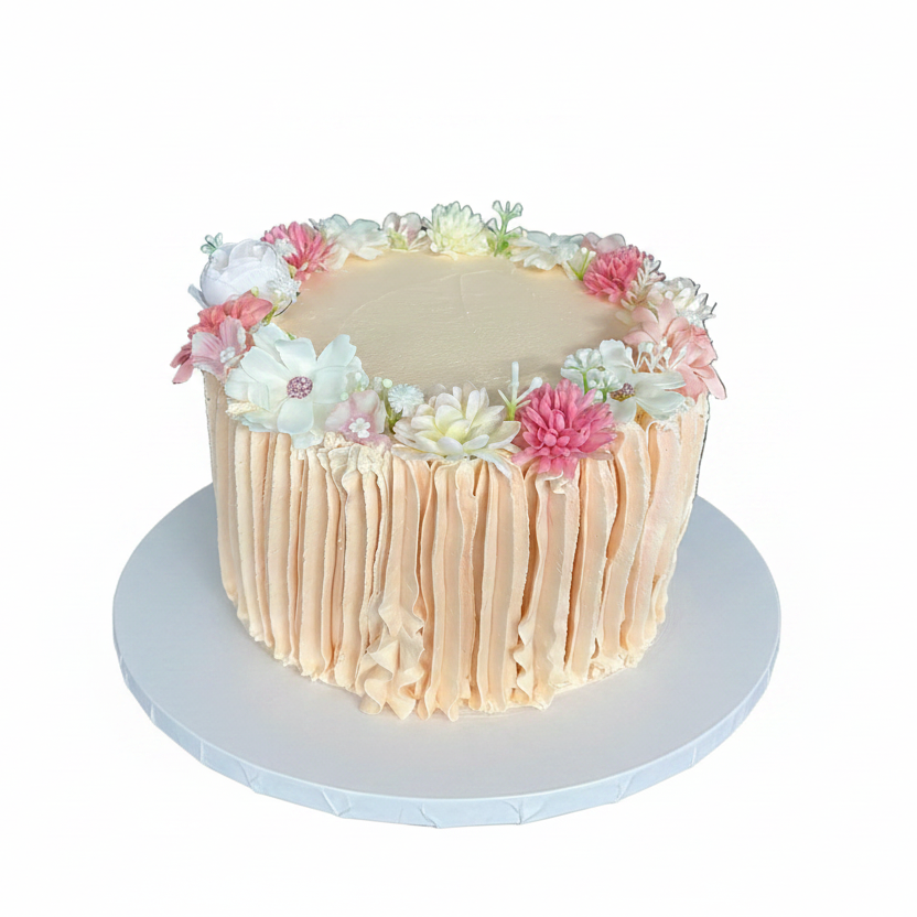 Elegant, timeless and beautifully detailed. The Bloom Ruffle Cake features soft buttercream ruffles wrapped around the cake, finished with artificial florals for a refined, modern look. Perfect for Mother's Day, corporate events, birthdays, baby showers, and special celebrations, this design is effortlessly sophisticated and customisable in your preferred colour palette.